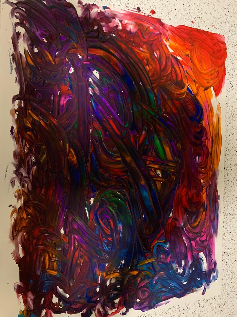 The experience I had while finger painting was soothing, and relaxing. Feeling the paint on my hands and watching as the paint glided over its canvas was almost hypnotizing. The difficulty of the task was almost exactly as I had imagined it, easy. I just let go and let the paint do the talking. The experience of not having to paint a subject was freeing. Just letting my hands and the paint create whatever they desired to was nice. My finger paint work is somewhat similar to other abstract works that I have seen, however, it is very different from paintings with subjects like George Washington crossing the Delaware.
